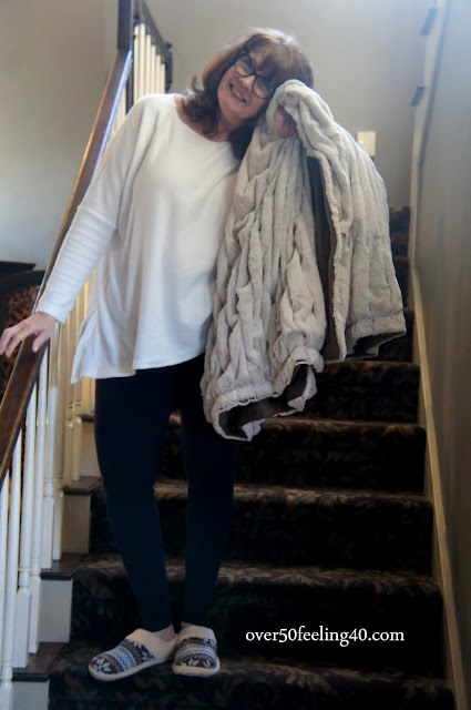 MY NEW THINKING: It really is easy to relax and look nice at the same time. Places like SOFT SURROUNDINGS provide us so many beautiful fabrics and options to wear while in recovery or relaxing. I now have about three older pair of leggings...which are in good shape that I only wear around the house...and they are so comfy with a FLEECE TOP like this one from Soft Surroundings, this exact top is sold out,... but there are others availabe in the same soft fabrics. I also, love, love, love my FAUX FUR THROW from Soft Surroundings...best Christmas gift!