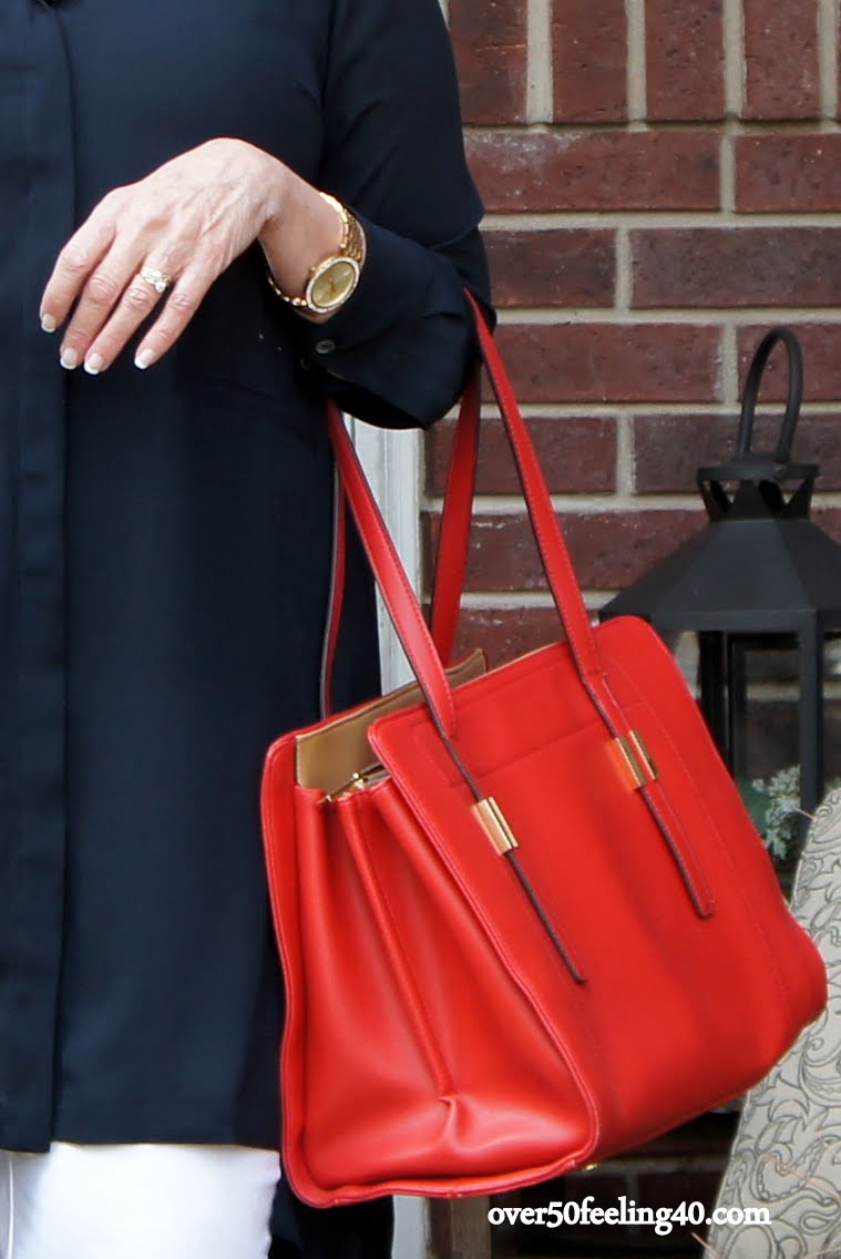 I love to pop color with accessories. This bag is larger and perfect for work as I can carry my IPAD and calendar in it. It even holds a file folder or two.