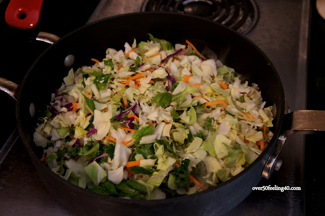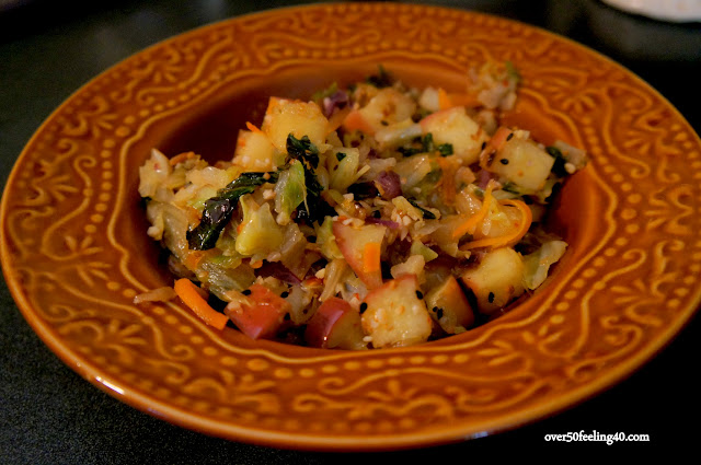 Here are the ingredients: A bag of DOLE CHOPPED SALAD KIT in Sunflower Crunch...Coconut Oil from Central Market...A dash of sea salt, a dash of Simply Asia Sweet Ginger Garlic from Costco... and a chopped apple!